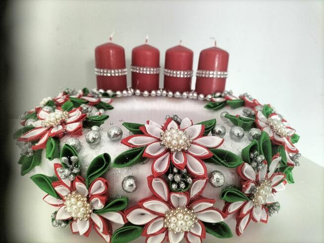 Piękny, ręcznie wykonany wieniec adwentowy z czerwonymi świecami i ozdobnymi kwiatami. Wieniec jest ozdobiony ...