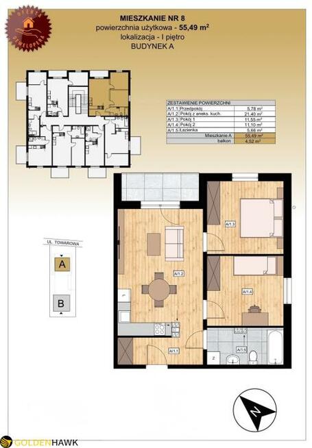 8Osiedle Perła Centrum MIESZKANIE NR 8 powierzchnia użytkowa - 55,49 m2 I piętro BUDYNEK A Mieszkanie trzypokojowe, ...