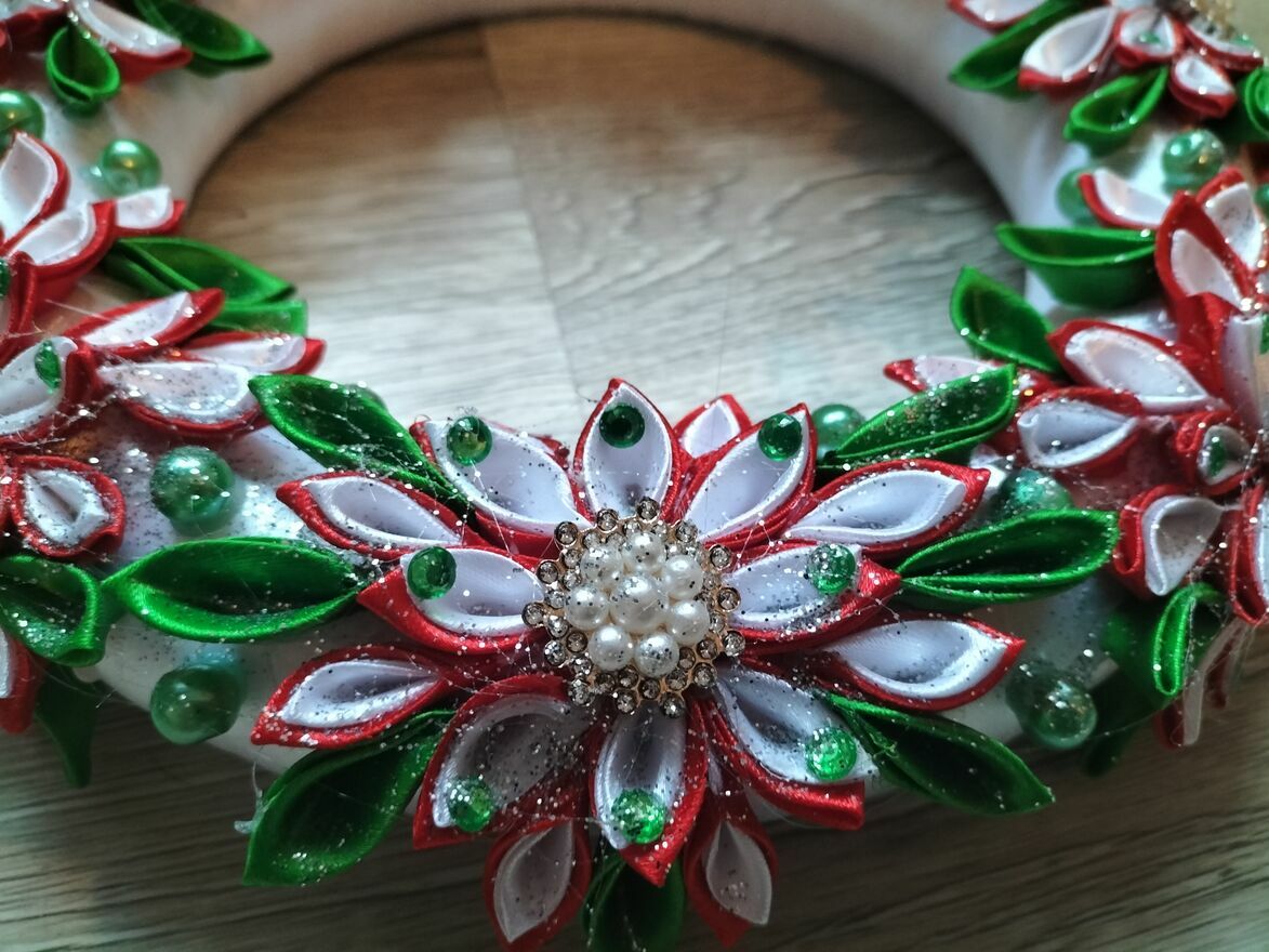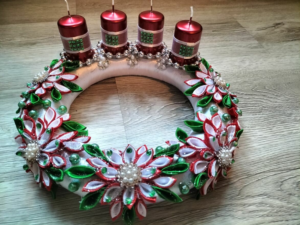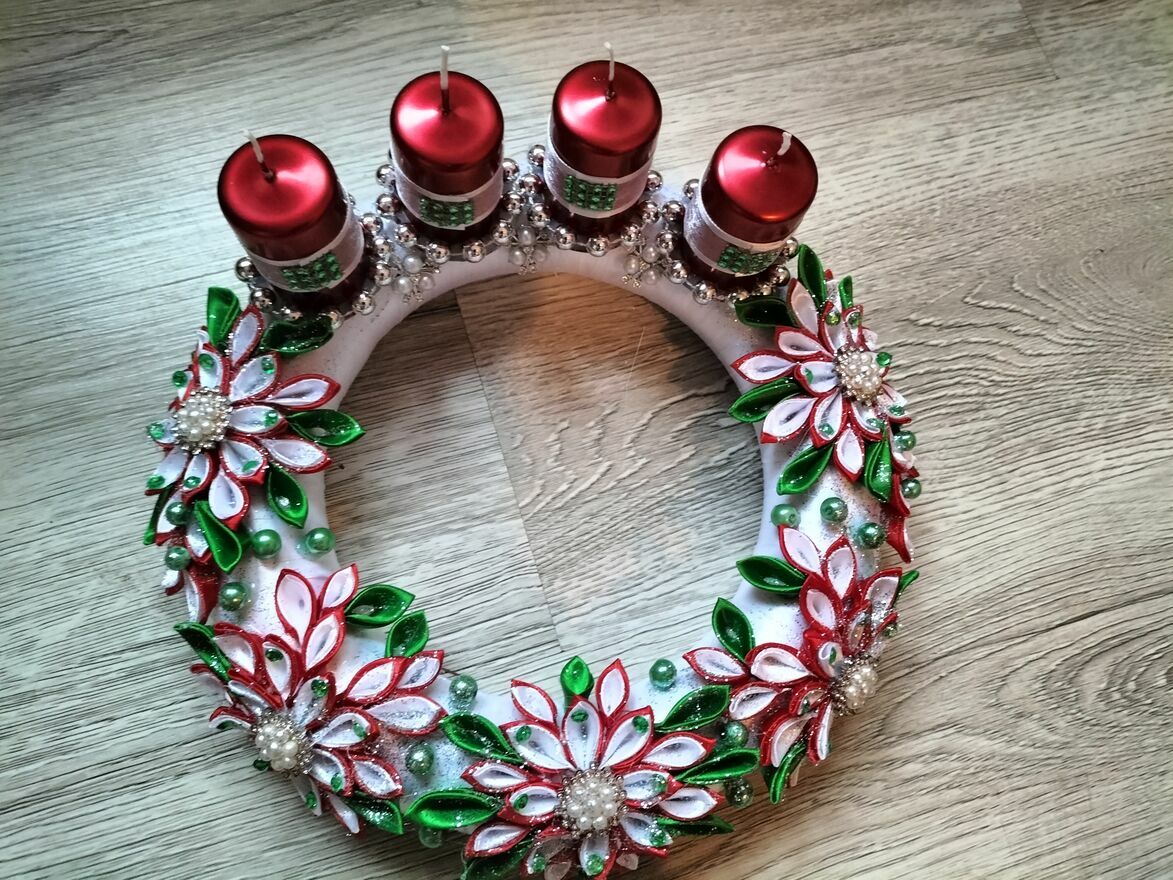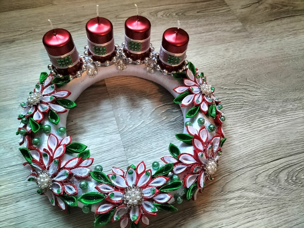 Piękny, ręcznie wykonany wieniec adwentowy ozdobiony kolorowymi, błyszczącymi kwiatami i świeczkami w odcieniach czerwieni. Idealny na świąteczny wystrój domu lub jako prezent. Wykonany z wysokiej jakości materiałów, zapewnia długotrwałe użytkowanie. Szerokość 28 cm, wysokość 5 cm, świeczki wysokość 6 cm.Magda