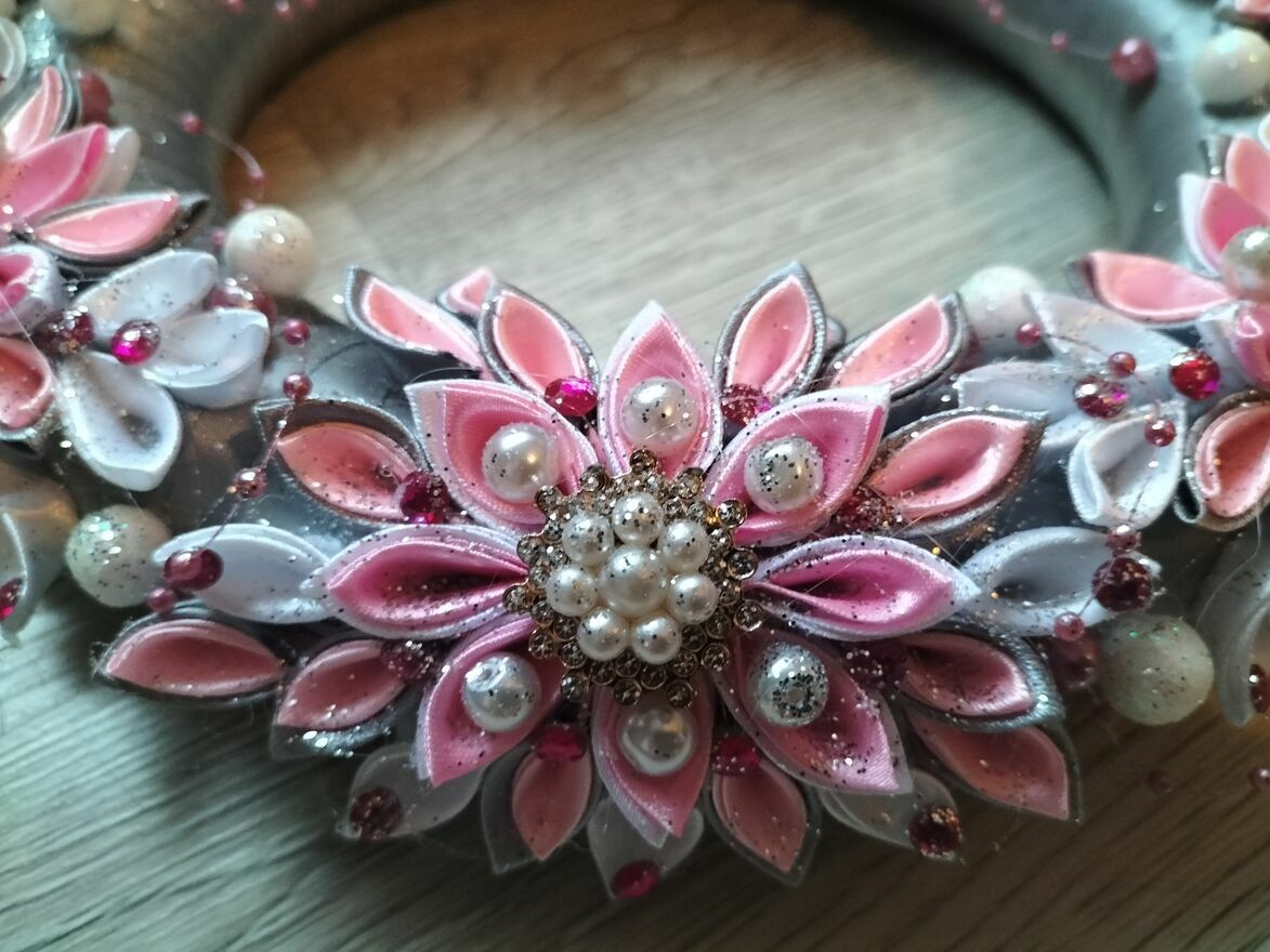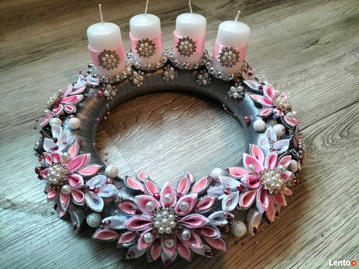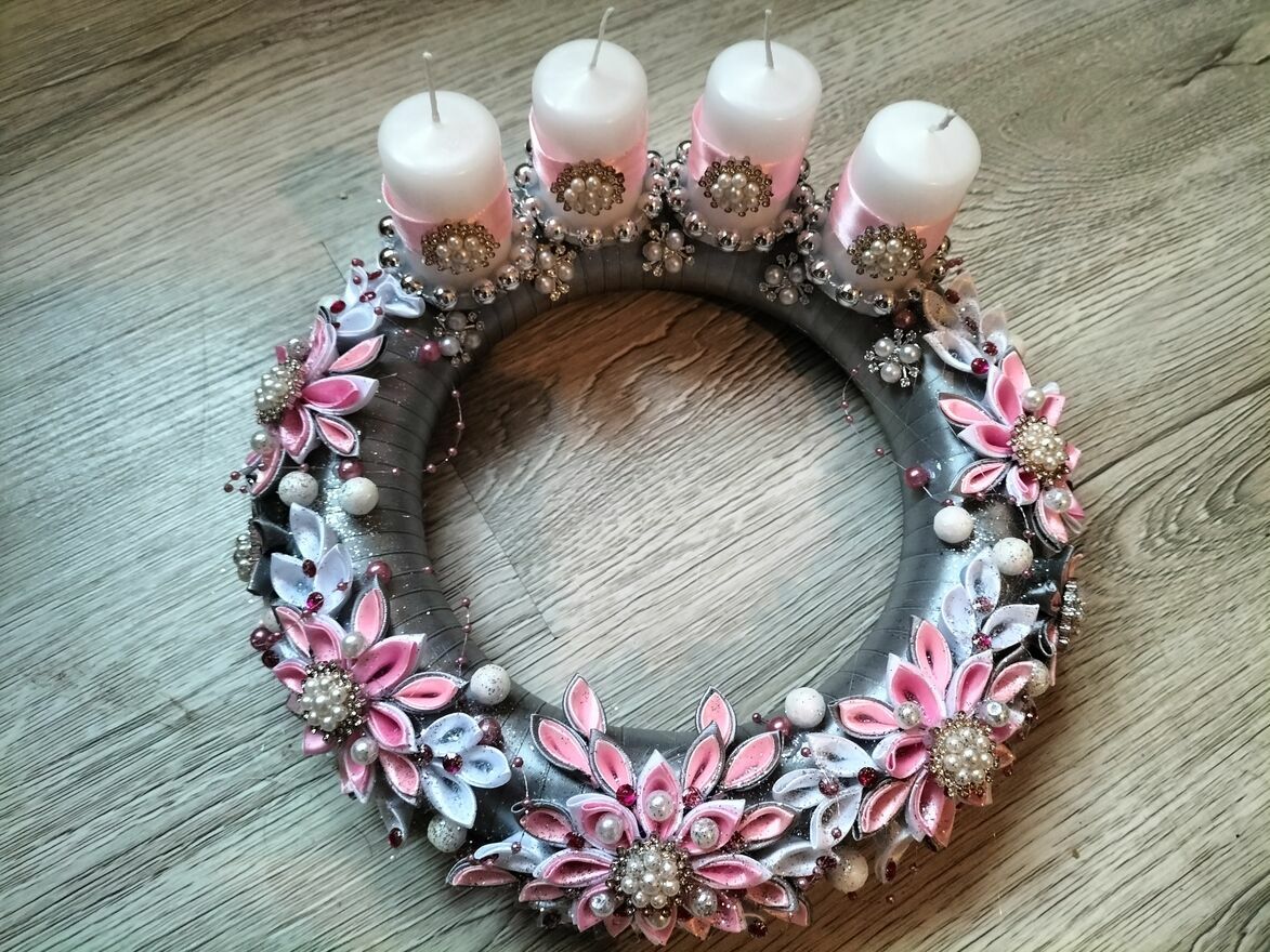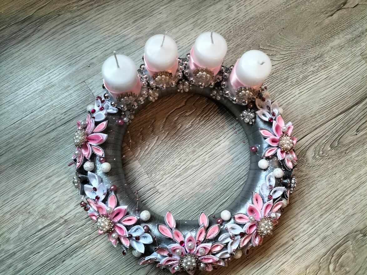 Piękny, ręcznie wykonany wieniec adwentowy w odcieniach różu i szarości. Dekoracja składa się z kwiatów, kryształków i świec. Idealny jako dekoracja świąteczna lub na specjalne okazje. Wieniec został wykonany z dbałością o szczegóły i będzie piękną ozdobą Twojego domu. Szerokość 28 cm, wysokość 5 cm, świeczki wysokość 6 cm.Magda