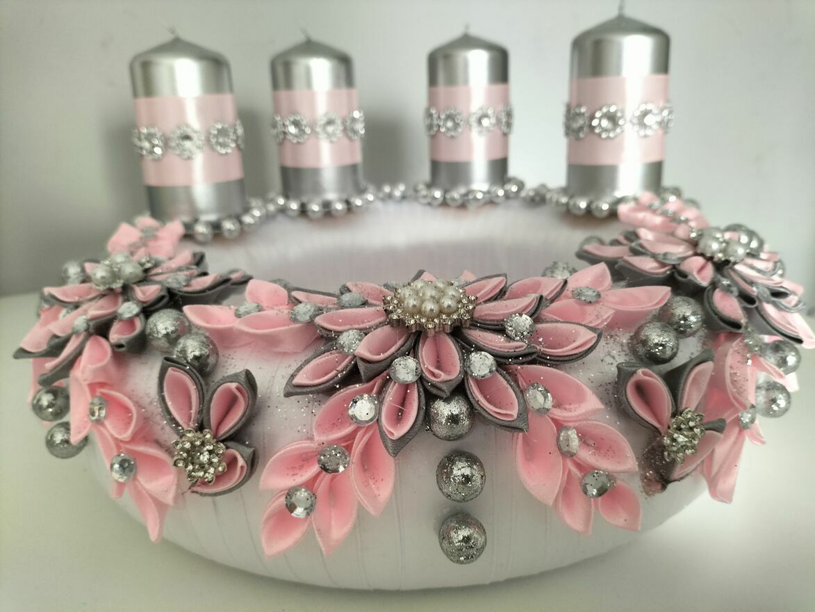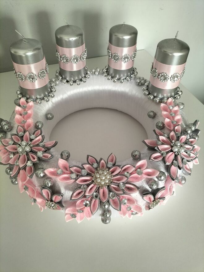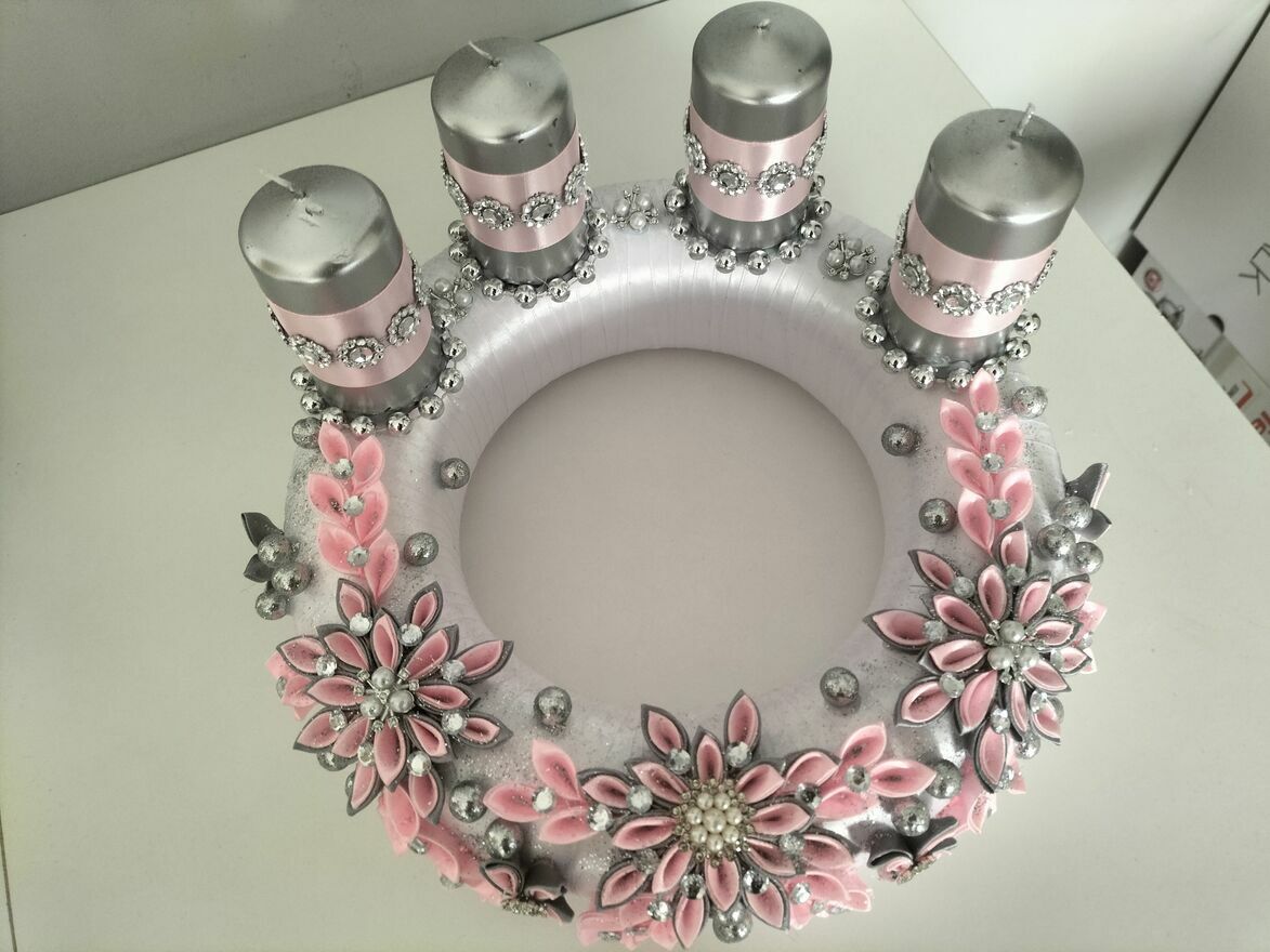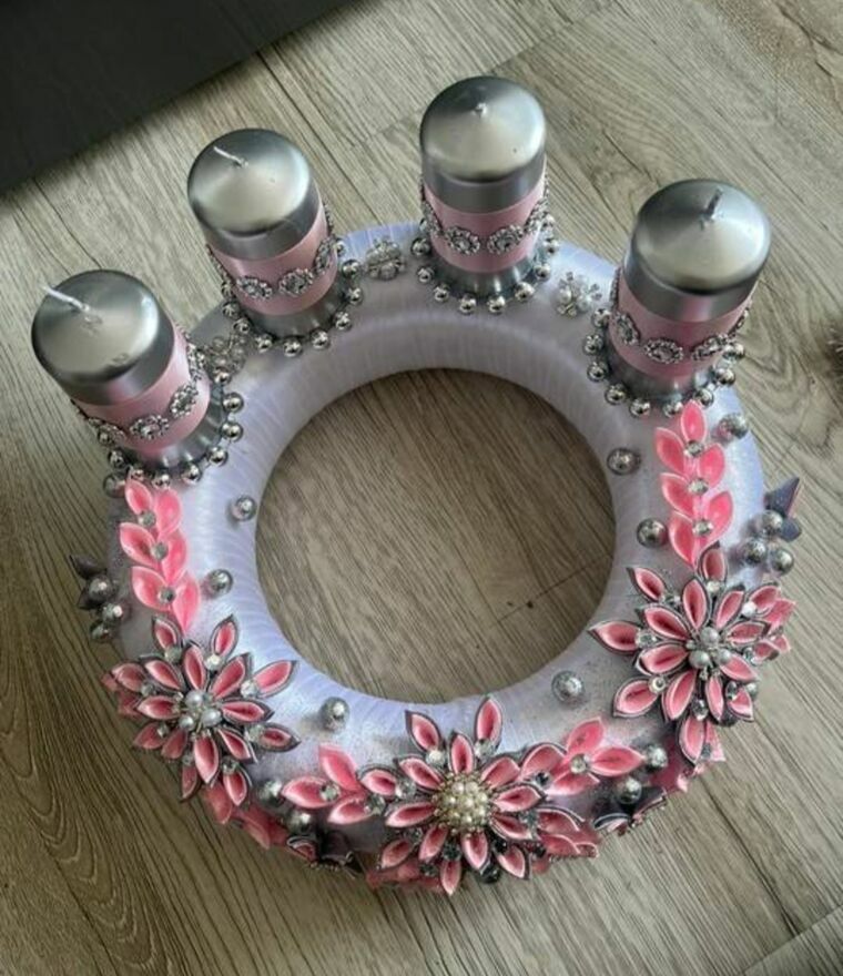 Piękny, ręcznie wykonany wieniec adwentowy w odcieniach różu i szarości. Ozdobiony jest kwiatami, perełkami i metalowymi elementami, tworząc elegancką i dekoracyjną całość. Idealny jako dekoracja na stół lub ścienny dodatek do domu na okres Bożego Narodzenia. Szerokość 30 cm, wysokość 10 cm.Wieniec jest naprawdę bardzo duży.Magda