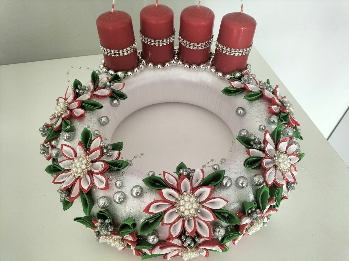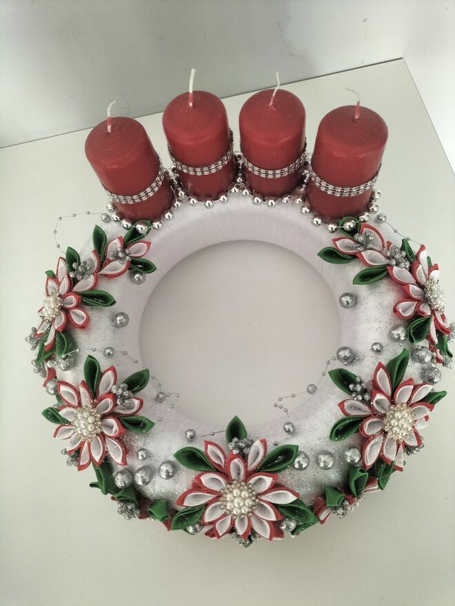 Piękny, ręcznie wykonany wieniec adwentowy z czerwonymi świecami i ozdobnymi kwiatami. Wieniec jest ozdobiony błyszczącymi elementami, które nadają mu elegancki wygląd. Idealny na świąteczny wystrój domu lub jako wyjątkowy prezent. Szerokość 30cm, wysokość 10 cm. Wieniec jest naprawdę bardzo duży.Magda